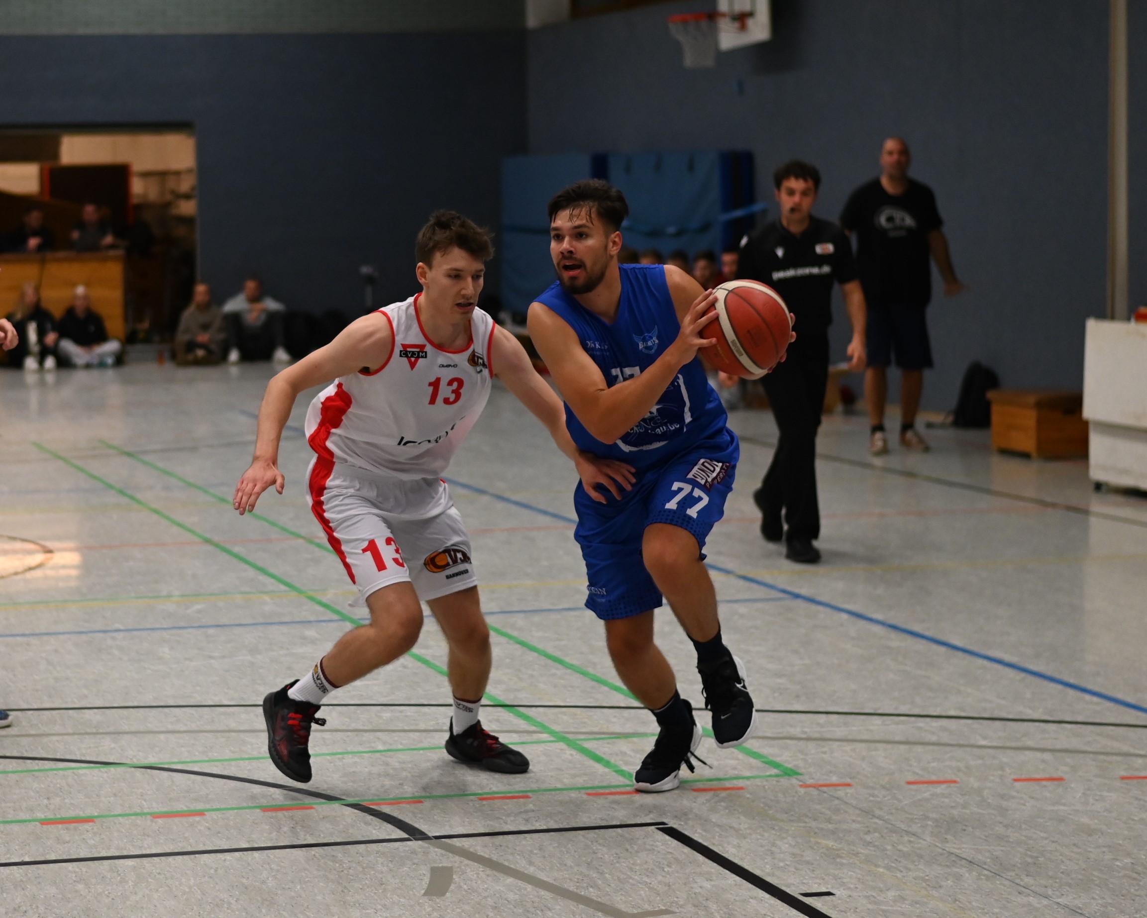 In der ersten Halbzeit startete Hannover besser und aggressiver in die Partie. Bei den Kleene Baskets war es die Defense, die den Unterschied machte. Während Hannover eng an den Leeraner Werfern dran waren und keinen Dreier zuließen, kamen die Gäste immer einen Schritt zu spät. CVJM zog auf 22:12 nach neun Minuten davon. Evaldas Jurgaitis brachte die Fortuna mit sechs Punkten in Folge wieder auf 18:22 heran. Bis zur 16. Minute verlief das Spiel dann ausgeglichen, bevor Hannover durch einen 9:2-Lauf sich eine 41:32-Halbzeitführung erspielte.