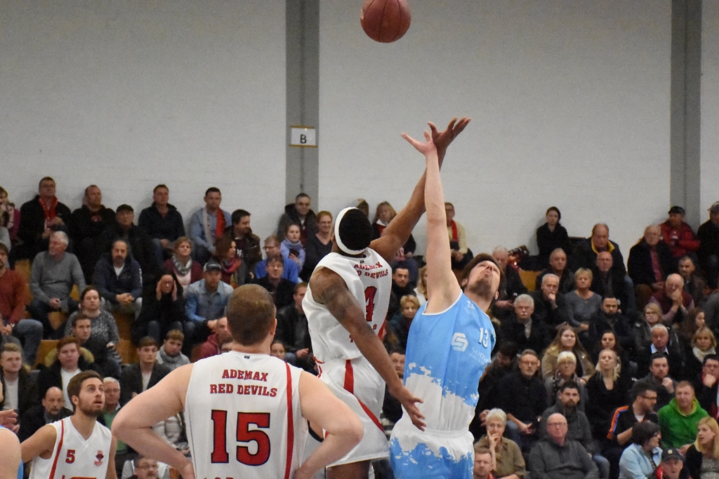 Bis zur 14. Minute (18:18) tat sich Bramsche schwer, begann dann aber, die Intensität in der Verteidigung noch einmal zu erhöhen. Immer wieder wurden die Logabirumer gedoppelt und fanden daraus nicht die optimalen Lösungen. Dennoch blieben die Ostfriesen hartnäckig dran und lagen zwei Minuten vor Ende der ersten Halbzeit nur 23:28 zurück. Dann fiel der Bramscher Jan-Philipp Seitz unglücklich auf den Fuß von Aufbauspieler Gaizelis, der nicht mehr weitermachen konnte. Die Red Devils nutzten das und erhöhten zur Halbzeit auf 35:23.